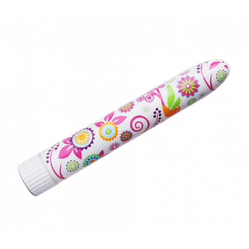 Vibrador juvenil ideal para principiantes, textura lisa fácil de penetrar. Con 15,5 cm insertable 2,5 de grosor. Diseño flores y mandalas. Importado desde USA.